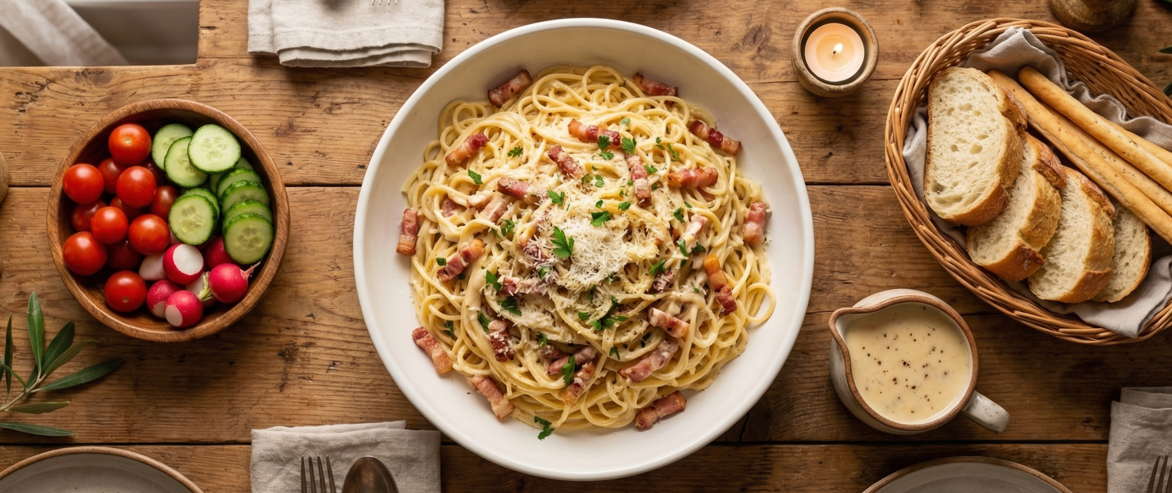 Легко и просто! Классическая паста карбонара с беконом в сливочном соусе настолько универсальна, что подходит под любые случаи. Особенно порадует она торопливых хозяек, не желающих проводить много времени на кухне. Всего 20 минут и вкусное второе блюдо готово!